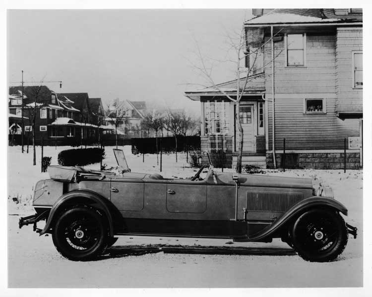 8x10 black and white Packard Co. file photograph of a 1927 Packard right side view, light in color, top lowered, parked on residential street, houses in background. Inscribed on photo back: Packard 343, third series eight (produced 8/2/1926-7/1/1927), 8-cylinder, 106-horsepower, 143-inch wheelbase, 4-person special sport phaeton, body by Locke.