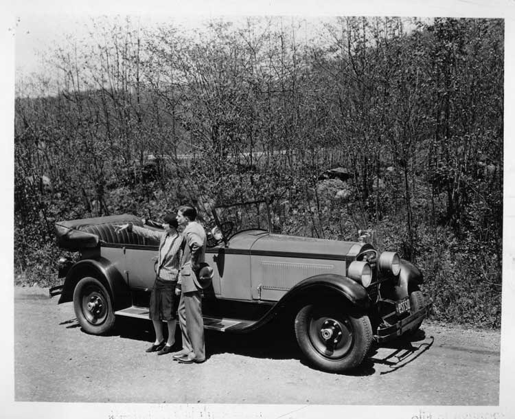8x10 black and white Packard Co. file photograph of a 1927 Packard seven-eights right front view, top lowered, male and female standing at driver's side door. Inscribed on photo back: Packard 343, third series eight (produced 8/2/1926-7/1/1927), 8-cylinder, 106-horsepower, 143-inch wheelbase, 7-person touring car (body type #290), fitted with Packard deluxe emblem, 1927 New Jersey license plate #D2729-2, note this particular photograph is printed in reverse.