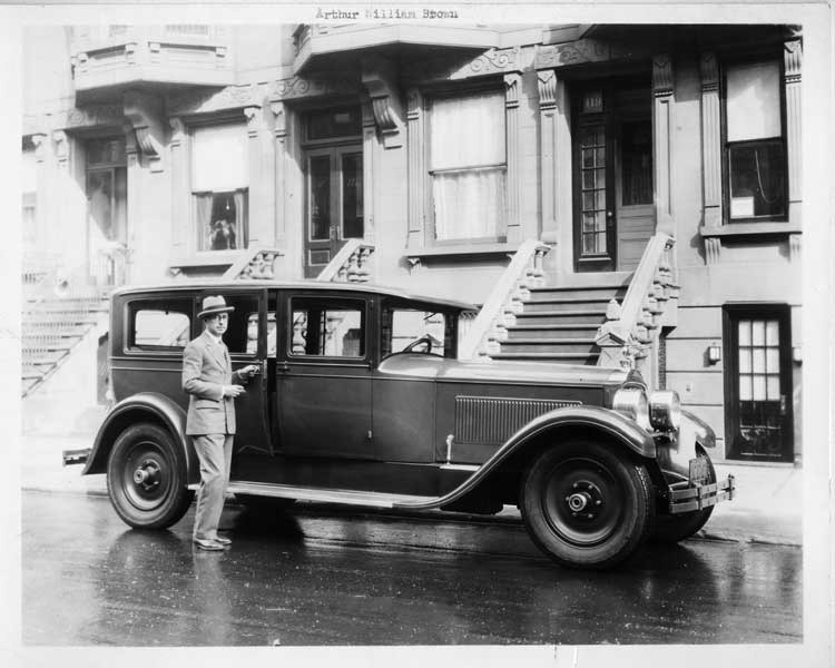 8x10 black and white Packard Co. file photograph of a 1927 Packard three-quarter right front view, parked on street in front of townhouses, owner Arthur William Brown at tonneau door . Inscribed on photo back: Packard 343, third series eight (produced 8/2/1926-7/1/1927), 8-cylinder, 106-horsepower, 143-inch wheelbase, 7-person sedan limousine (body type #295), fitted with Packard deluxe emblem, 1927 New York license plate #8C-87-87, Arthur William Brown illustrator, photographed in New York.