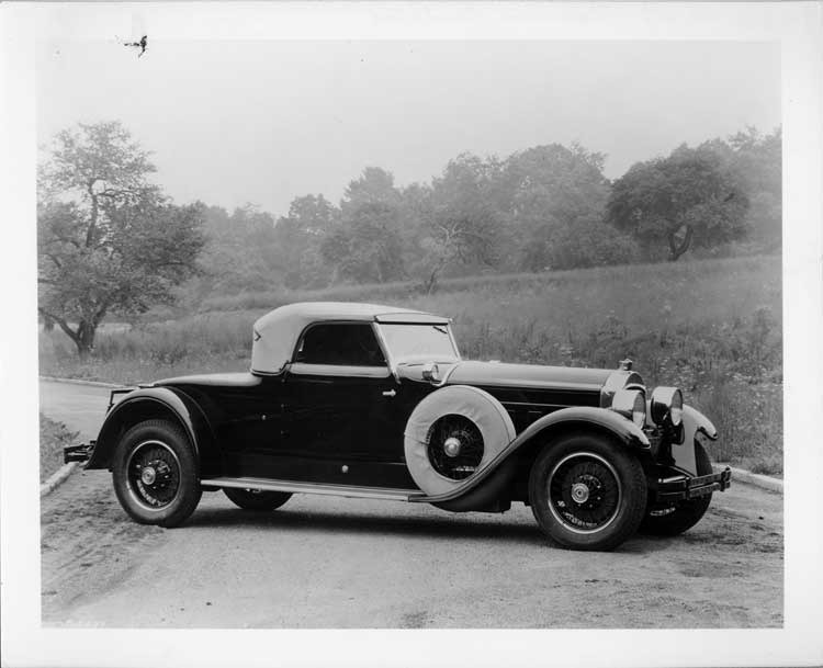8x10 black and white Packard Co. file photograph of a 1928 Packard seven-eights right front view, top raised, side mounted spare, with cloth cover that matches the fabric of the top, parked on country road. Inscribed on photo back: 1928 Packard, Model 443, Derham roadster.