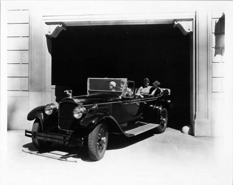 8x10 black and white Packard Co. file photograph of a 1928 Packard pulling out of garage with female driver & three female passengers. Inscribed on photo back: Packard 533, fifth series six (produced 7/1/1927-8/1/1928), 6-cylinder, 81-horsepower, 133-inch wheelbase, 7-person touring car (body style #320), one-half left side front view, top folded, fitted with Packard deluxe emblem, wind wings, rear-view mirror above left fender.