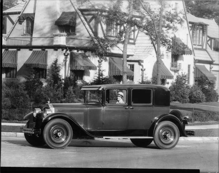 1928 Packard club sedan, parked on residential street, female driver at wheel