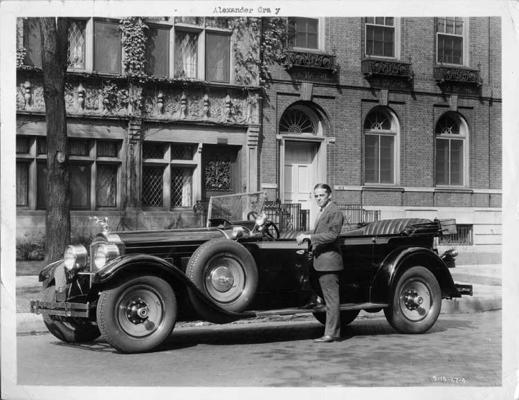 1928 Packard touring car, actor Alexander Gray standing at driver's door