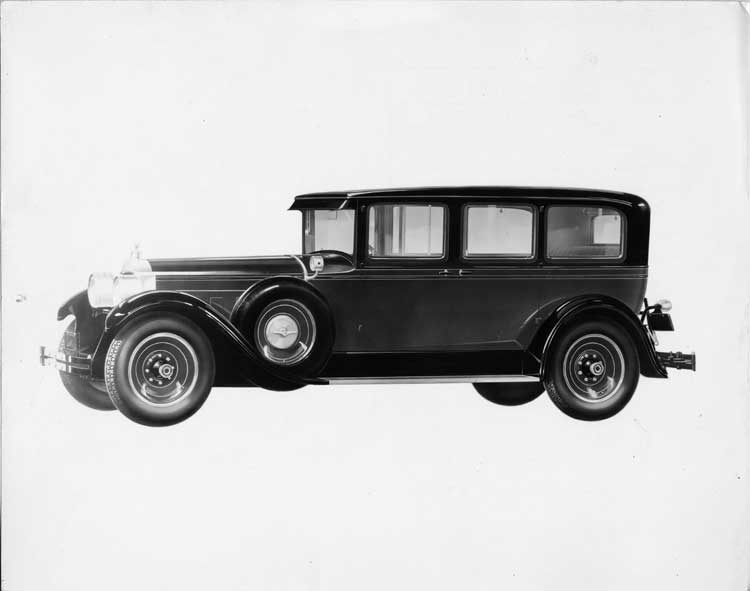 8x10 black and white Packard Co. file photograph of a 1928 Packard. Inscribed on photo back: Packard 443, custom eight (produced 7/1/1927-8/1/1928), fourth series eight, 8-cylinder, 106-horsepower, 143-inch wheelbase, 7-person sedan limousine (body type #315), left seven-eights side front.