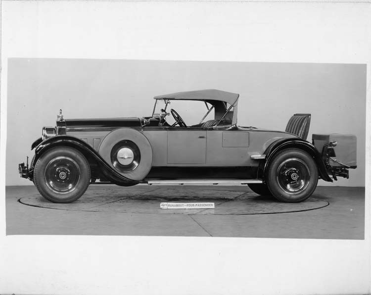 7.5x9.5 black and white Packard Co. file photograph of a 1928 Packard. Inscribed on photo back: Packard 443, custom eight (produced 7/1/1927-8/1/1928), fourth series eight, 8-cylinder, 106-horsepower, 143-inch wheelbase, 2/4-person runabout (body type #312), left nine-tenths side front, top raised, rear deck open, note absent belt-line color panel, prototype late 1926.