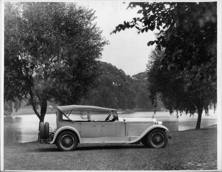1928 Packard phaeton, nine-tenths right rear view, top raised, water and trees in background
