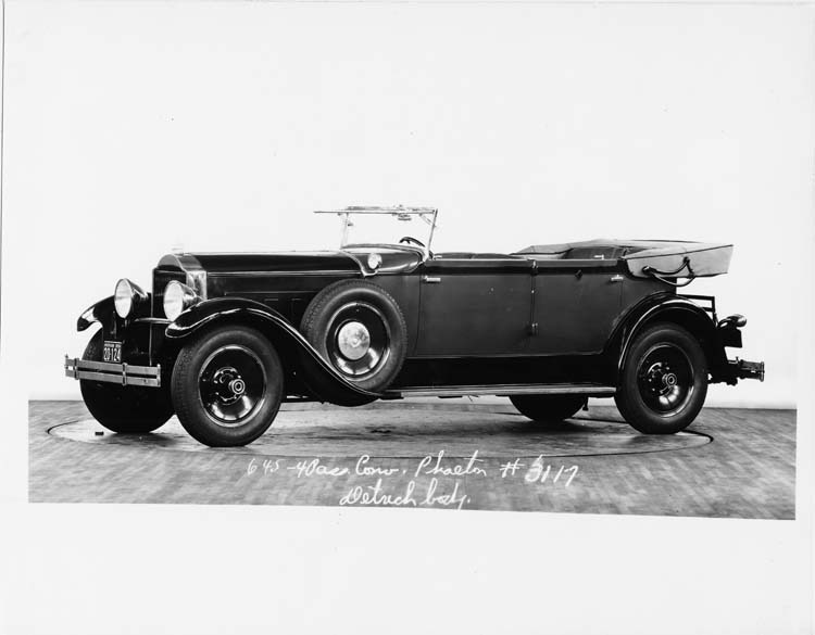 7.5x9.5 black and white Packard Co. file photograph of a 1929 Packard seven-eights left front view, top folded. Inscribed on photo back: Packard 645, individual custom deluxe eight, sixth series, 8-cylinder, 106-horsepower, 145.5-inch wheelbase, 5-person convertible sedan (body style #1602), body by Dietrich, note prototype, monogram panel/plate, 1928 Michigan license plate #20-124.