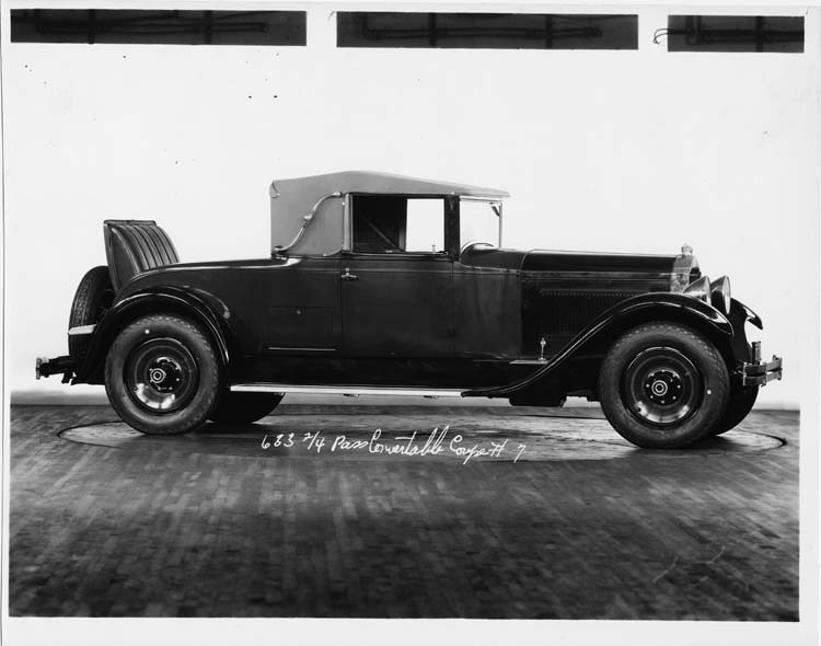 7.5x9.5 black and white Packard Co. file photograph of a 1929 Packard right side view, top raised, rumble seat open. Inscribed on photo back: Packard 633, standard eight, sixth series, 8-cylinder, 90-horsepower, 133.5-inch wheelbase, 2/4-person convertible coupe, prototype, proposed/rejected.
