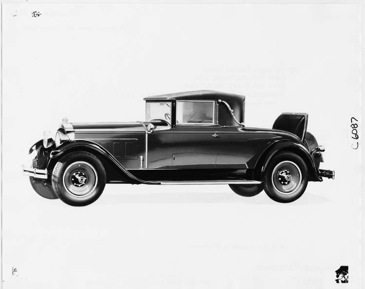 8x10 black and white Packard Co. file photograph of a 1929 Packard nine-tenths left front view, top raised, rumble seat open. Inscribed on photo back: Packard 640, custom eight, sixth series, 8-cylinder, 106-horsepower, 140.5-inch wheelbase, 2/4-person convertible coupe (body type #349), with standard fittings, note slight scoop in door window reveal: present in prototype, omitted in production, catalogue rendering.