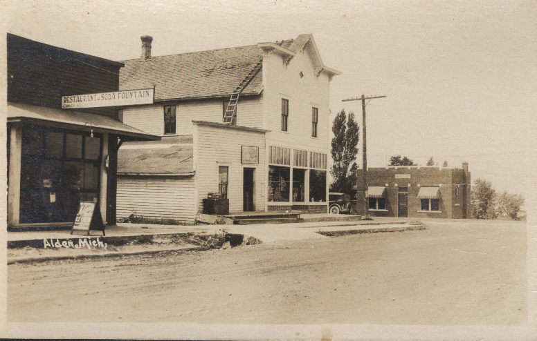 Black and white postcard of Helena Street near Coy Street, Alden, Michigan, ca. 1925