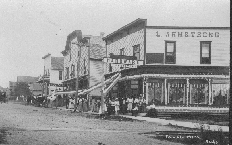 Black and white postcard of Helena Street east from Armstrong store, which is decorated in bunting. Image includes Bank, pedestrians and cariages with horses. Alden, Michigan, ca. 1910