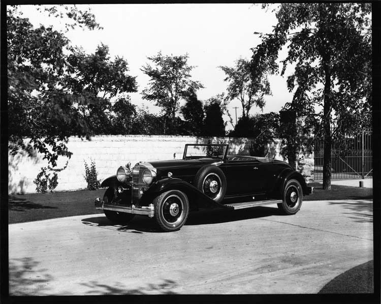 1932 Packard coupe roadster, top folded, parked by gate of Packard Proving Grounds