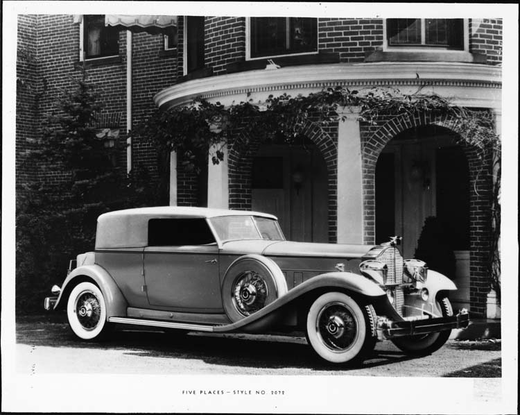 8x10 black and white Packard Co. file photograph of a 1932 Packard three-quarter right side view, top raised, light in color, Packard deluxe emblem, parked in front of house. Inscribed on photo back: Packard 904, deluxe eight, ninth series, 8-cylinder, 135-horsepower, 147.125-inch wheelbase, 4-person convertible victoria (body style #2072), by Dietrich.