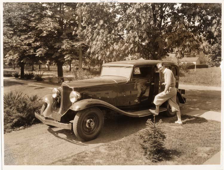 1932 Packard sedan, owner Guy Bonham standing at driver's door, Long Island, N.Y.