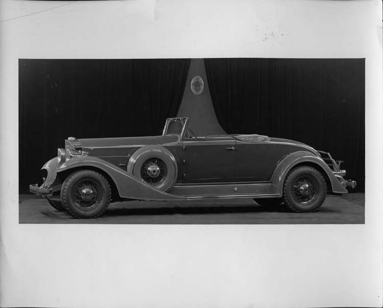 8x10 black and white Packard Co. file photograph of a 1933 Packard left side view, top folded. Inscribed on photo back: Packard 1004, super eight, tenth series, 8-cylinder, 145-horsepower, 142-inch wheelbase, 2/4-person coupe-roadster (body type #659), note hub caps 'Packard Motor Car Co./Detroit, Mich. USA,' side wheel carrier with metal wheel covers, convertible top in down position.