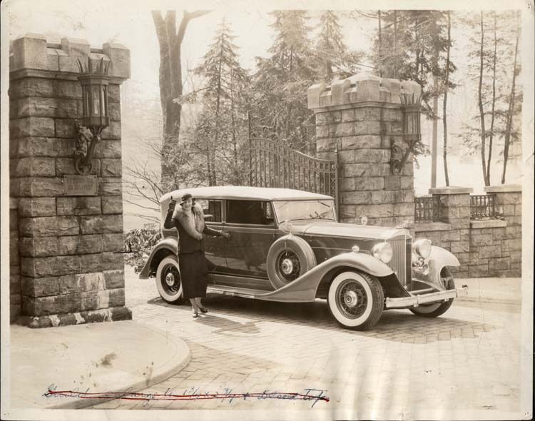 1933 Packard coupe-roadster in stone gateway with Mary Lee Brennan, Richmond Hill