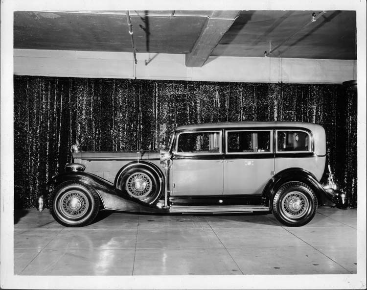 8x10 black and white Packard Co. file photograph of a 1933 Packard left side view. Inscribed on photo back: Packard 1006 twelve, tenth series, 12-cylinder, 160-horsepower, 147-inch wheelbase, 7-person special bullet-proof sedan limousine (original body type #635), built for the president of the Dominican Republic, note pilot ray lamp, wood-lights, in place of standard head lights, two running board spotlights, no fender lights.