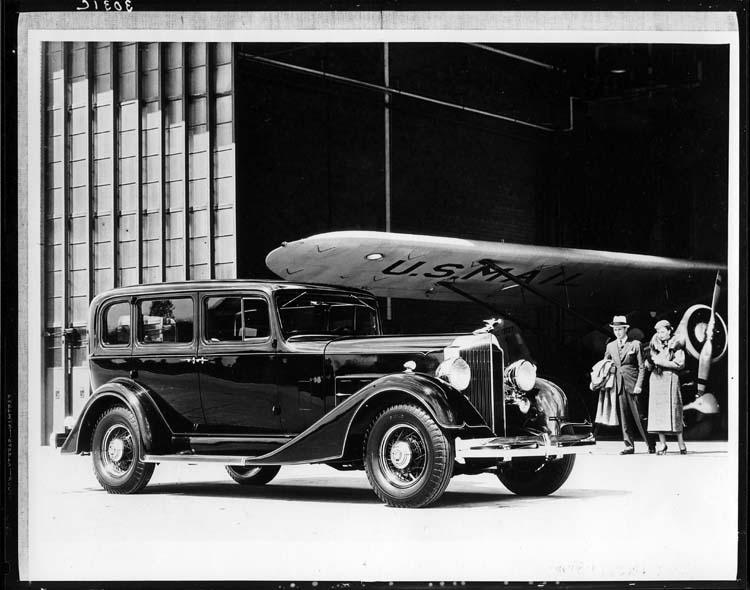 1934 Packard sedan with U.S. mail plane at airplane hangar