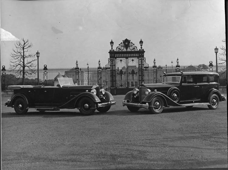 8x10 black and white Packard Co. file photograph of two 1934 Packards three-quarter side views. Inscribed on photo back: left; Packard 1101 eight, eleventh series, 8-cylinder, 120-horsepower, 136-inch wheelbase, 7-person touring car (body type #710), right; Packard 1108 twelve, eleventh series, 12-cylinder, 160-horsepower, 147-inch wheelbase, 5-person special sedan limousine (body type #735), note roof lights, wood wheels, Packards of Emperor Kang Teh of Manchukuo painted specially in imperial crimson, each car bearing Emperor's crest on doors & radiator cap emblems, photographed before gates of Imperial Detached Palace at Akasaka, Tokyo (in 1922-23 this was the palace of the Prince Regent of Japan).