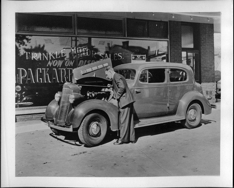 8x10 black and white Packard Co. file photograph of a 1935 Packard three-quarter left front view, parked on city street, Mr. Harry S. Trinkle looking under hood. Inscribed on photo back: Packard one twenty, model 120, twelfth series, 8-cylinder, 110-horsepower, 120-inch wheelbase, 5-person touring coupe (body type #894), Packard Motor Car Co. branches, distributorships, dealerships, agencies, Trinkle Motor Sales, New Albany, Ky., Harry S. Trinkle.
