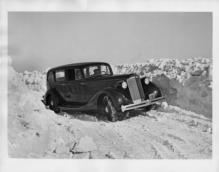 1936 Packard sedan, coming around snowy corner, male driver and passenger