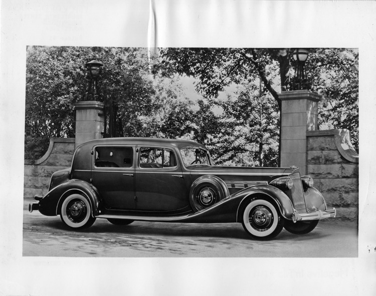 1936 Packard club sedan, nine-tenths right side view, parked in front of stone gateway