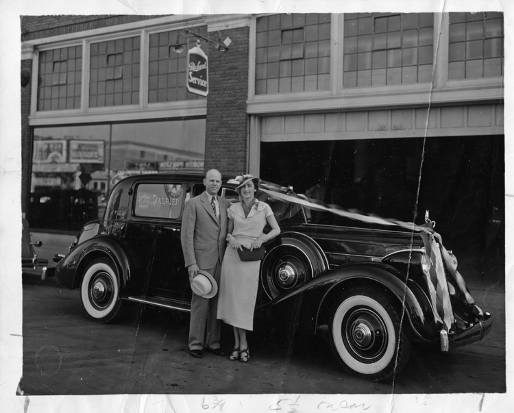 8x10 black and white Packard Co. file photograph of a 1936 Packard nine-tenths right side view, parked in front of Packard service department, couple standing at side, written on rear passenger side window 'Just Married,' streamers on front of car. Inscribed on photo back: Packard eight, fourteenth series, model 1401, 8-cylinder, 130-horsepower, 134-inch wheelbase, 5-person club sedan (body type #916), note white sidewall tires, 6-wheel equipment, pelican emblem.