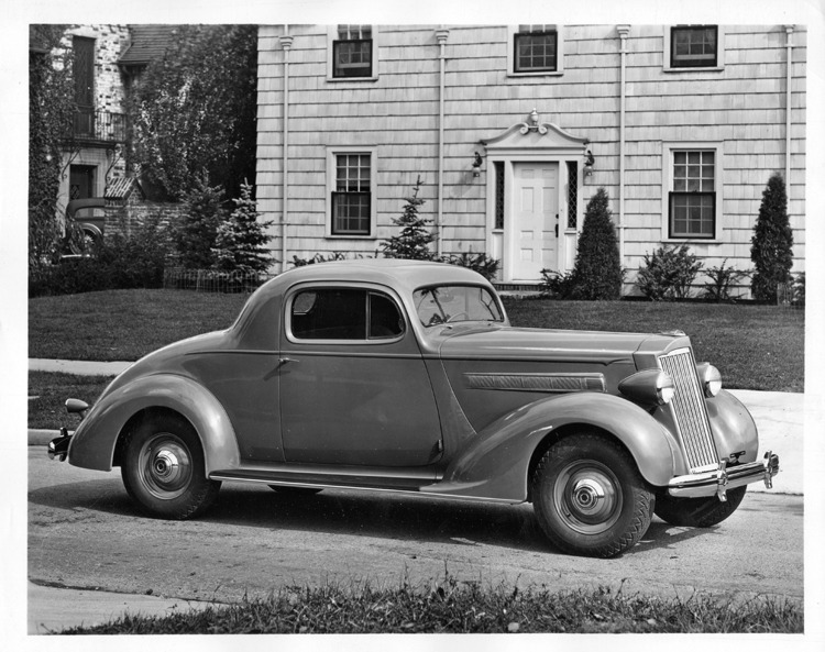 8x10 black and white Packard Co. file photograph of a 1936 Packard seven-eights right side view, parked on street in front of house. Inscribed on photo back: Packard one twenty, fourteenth series, model 120-B, 8-cylinder, 120-horsepower, 120-inch wheelbase, 2-person business coupe (body type #998).