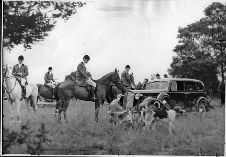 1937 Packard touring sedan, surrounded by men and dogs on a fox hunt