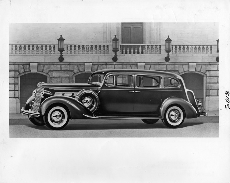 8x10 black and white Packard Co. file photograph of a 1937 Packard nine-tenths right side view, parked behind the Detroit Institute of Arts (east side). Inscribed on photo back: Packard one twenty, fifteenth series, model 138-C-D, 8-cylinder, 120-horsepower, 138-inch wheelbase, 7-person touring sedan (body type #1091-CD), note white sidewall tires, fender wells, 6-wheels, trunk rack, standard door handles, absent rear license plate bracket.