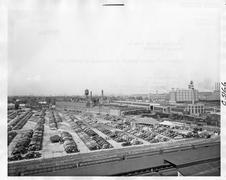 1937 newly-produced Packards in aerial view of Packard plant