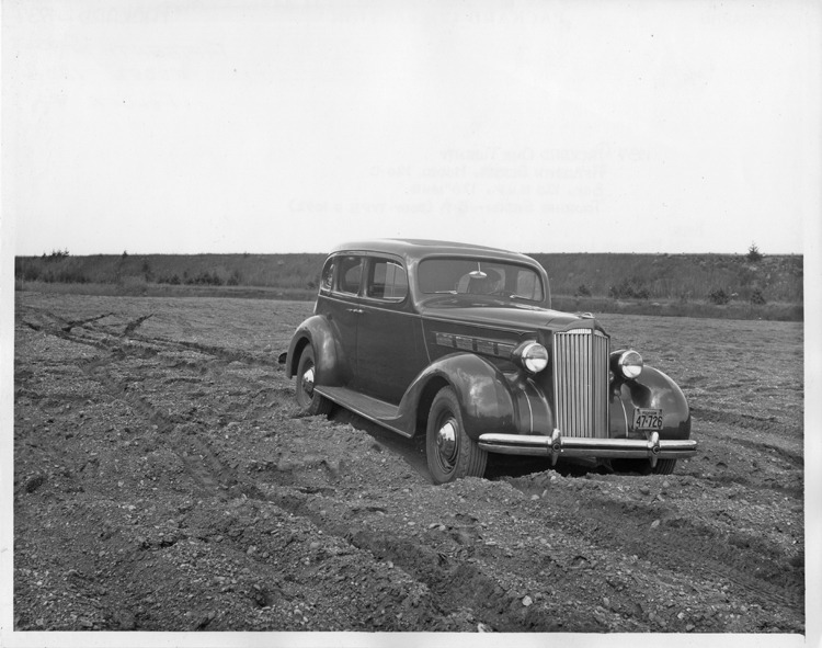 1937 Packard touring sedan in dirt field at Packard Proving Grounds