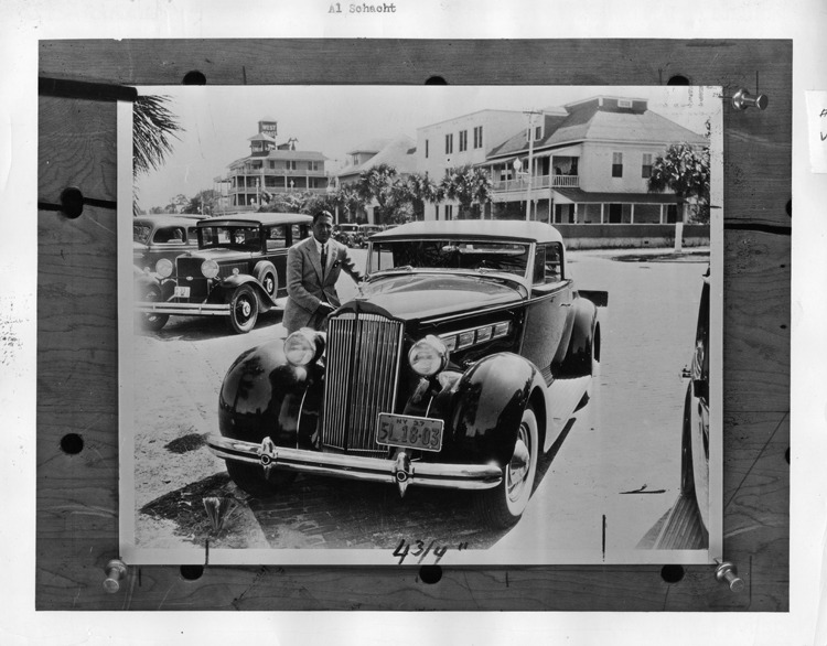 8x10 black and white Packard Co. file photograph of a 1937 Packard three-quarter front view, top raised, male standing at passenger door. Inscribed on photo back: Packard one twenty, fifteenth series, model 120-C, 8-cylinder, 120-horsepower, 120-inch wheelbase, 2/4-person convertible coupe (body type #1099), note 1937 New York license plate #5L18-83 & license plate frames, white sidewall tires & wheel trim rings, auto, Al Schact- famous baseball personality & member of Baseball Hall of Fame, known as the Crown Prince of Baseball.