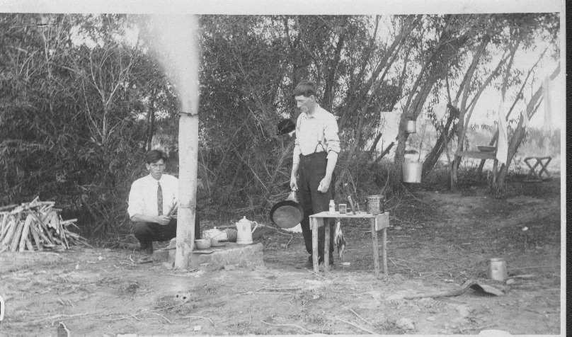 Black and white postcard of two men cooking at a campsite, Alden, Michigan, ca. 1910
