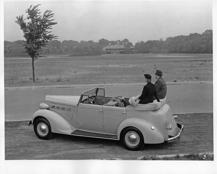 1937 Packard convertible sedan, couple sitting on folded top at Belle Isle
