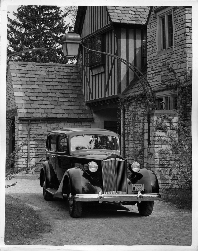 8x10 black and white Packard Co. file photograph of a 1937 Packard three-quarter front view, parked in driveway of home. Inscribed on photo back: Packard super eight, fifteenth series, model 1500, 8-cylinder, 135-horsepower, 127-inch wheelbase, 5-person touring sedan (body type #1003), note 1936 Michigan license plate #U7680, proposed/rejected 'senior Eight' hub caps, as shown, windshield wipers point left in 'off' position, pointed right on production cars, setting: residence Grosse Pointe, Michigan.