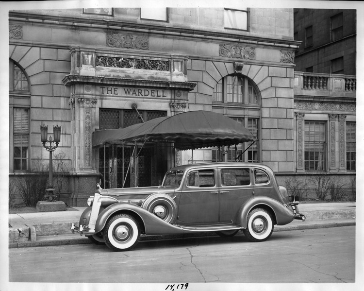 1937 Packard touring sedan, parked on street in front of The Wardell