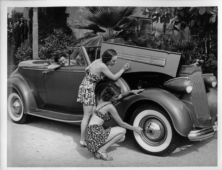 6.5x8.5 black and white Packard Co. file photograph of a 1937 Packard three-quarter right side view, hood partially open, two females in bathing suits at front, one female in passenger seat. Inscribed on photo back: Packard super eight, fifteenth series, model 1501, 8-cylinder, 135-horsepower, 134-inch wheelbase, 5-person convertible victoria (body type #1007), note white sidewall tires, fender wells, 6-wheels, trunk rack (not see in photograph), Packard deluxe emblem, setting: Florida