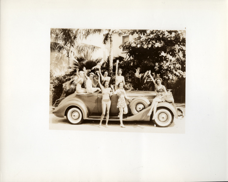 8x10 black and white sepia-toned Packard Co. file photograph of a 1937 Packard right side view, top folded, seven females in swim suits sitting in and around car. Inscribed on photo back: Packard super eight, fifteenth series, model 1501, 8-cylinder, 135-horsepower, 134-inch wheelbase, 5-person convertible victoria (body type #1007), note white sidewall tires, fender wells, 6-wheels, trunk rack (not see in photograph), Packard deluxe emblem, setting: Florida