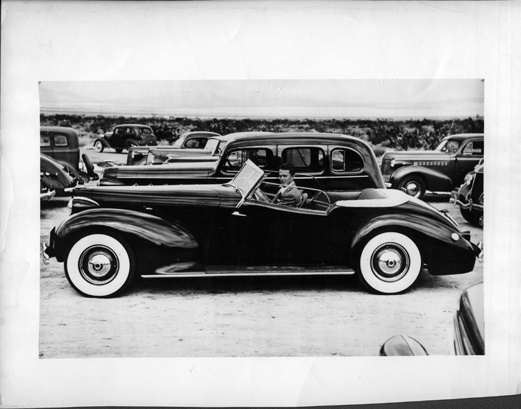 1938 Packard convertible victoria, left side view, top folded, Alvin Macauley, Jr. behind wheel
