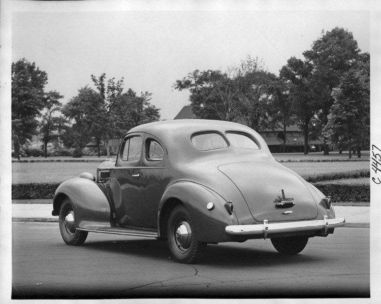 8x10 black and white Packard Co. file photograph of a 1938 Packard three-quarter left rear view. Inscribed on photo back: Packard six, sixteenth series, model 1600, 6-cylinder, 100-horsepower, 122-inch wheelbase, 2-person business coupe (body type #1188), prototype, note pre-production tail lights.