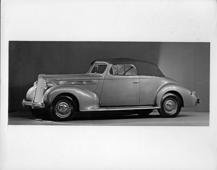 8x10 black and white Packard Co. file photograph of a 1938 Packard seven-eights left side view, top raised. Inscribed on photo back: Packard eight, sixteenth series, model 1601, 8-cylinder, 120-horsepower, 127-inch wheelbase, 2/4-person convertible coupe (body type #1199), prototype, note non-production 'one twenty' hub caps, non-production bumper guards, non-production bumper (painted center band).