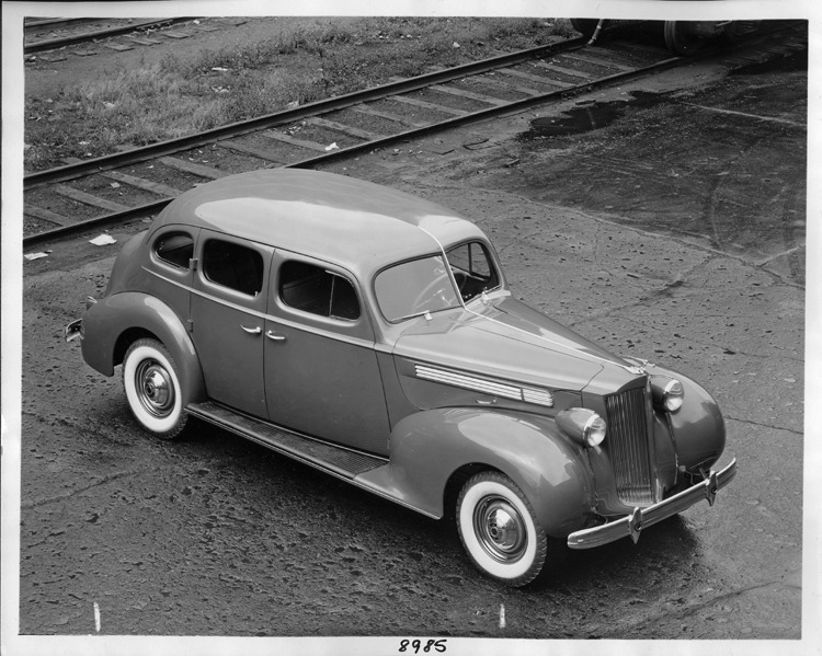 1938 Packard touring sedan parked near railroad tracks