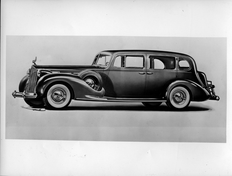 8x10 black and white Packard Co. file photograph of a 1939 Packard nine-tenths left side view, top raised. Inscribed on photo back: Packard twelve, seventeenth series, model 1707, 12-cylinder, 175-horsepower, 134-inch wheelbase, 5-person touring sedan (body type #1233), note wheel trim beauty rings, fender wells & 6-wheels, pelican emblem, dual white sidewall tires, trunk rack.