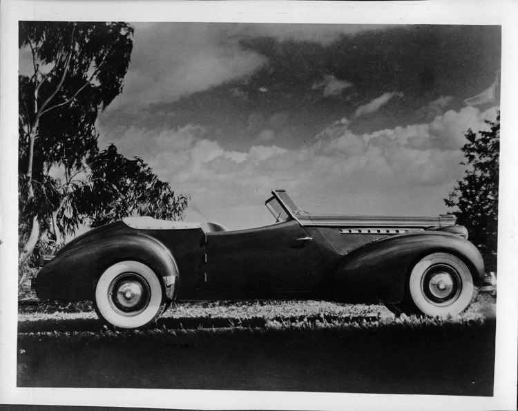 8x10 black and white Packard Co. file photograph of a 1939 Packard right side view, top folded, parked on grass. Inscribed on photo back: Packard super eight, seventeenth series, model 1703, 8-cylinder, 130-horsepower, 127-inch wheelbase, convertible victoria, by Darrin, note wheel trim beauty rings, vogue white sidewall tires.