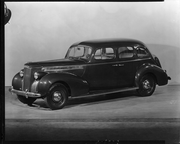 8x10 black and white Packard Co. file photograph of a 1940 Packard three-quarter left side view. Inscribed on photo back: Packard one twenty, eighteenth series, model 1801, 8-cylinder, 120-horsepower, 127-inch wheelbase, 4-door, 5-person touring sedan (body type #1392), prototype, non-production features; earlier series eight hub caps, absent parking lamps, louver panel & medallions, earlier series door handles, absent stamping around at side window, early production features; tapered bumper ends.