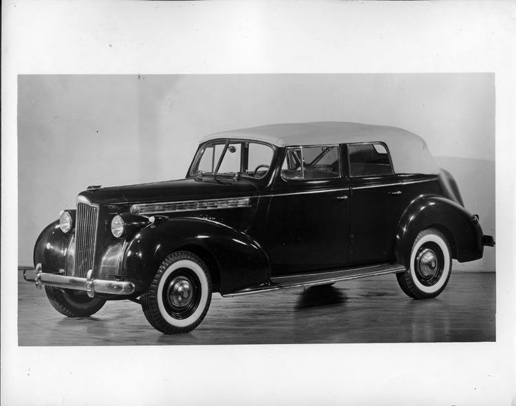 1940 Packard convertible sedan, three-quarter left side view, top raised