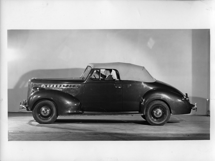 8x10 black and white Packard Co. file photograph of a 1940 Packard left side view, top raised. Inscribed on photo back: Packard one ten, eighteenth series, model 1800, 6-cylinder, 100-horsepower, 122-inch wheelbase, 2/4-person convertible coupe (body type #1389), prototype, note A) non-production; sixteenth series exterior door handle, previous series oval rear view mirror, hub caps, belt-line chrome trim which ends at aft edge of hood side panel, B) early 18th series production; bumper with tapered ends, hood side medallion at forward end of hood side louver panel, 1939 Michigan license plate #W54896.