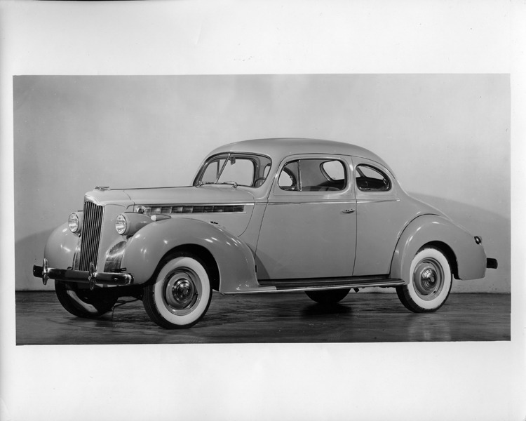8x10 black and white Packard Co. file photograph of a 1940 Packard nine-tenths left side view, top folded. Inscribed on photo back: Packard one ten, eighteenth series, model 1800, 6-cylinder, 100-horsepower, 122-inch wheelbase, 2/4-person convertible coupe (body type #1385), prototype, note A) non-production; 'Packard 110' hub caps, bumpers having rounded ends, '110' on hood side louver panel medallion, B) accessories; dual white sidewall tires.