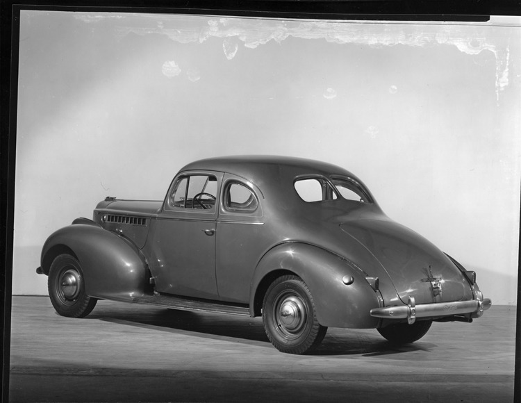 8x10 black and white Packard Co. file photograph of a 1940 Packard three-quarter rear left view. Inscribed on photo back: Packard one twenty, eighteenth series, model 1801, 8-cylinder, 120-horsepower, 127-inch wheelbase, 2/5-person club coupe (body type #1395), prototype, early 18th series production features only features; tapered bumper ends, louver panel medallion, hub caps, non-production features; absent parking lamp, absent stamping around side windows as described by striping shown here.